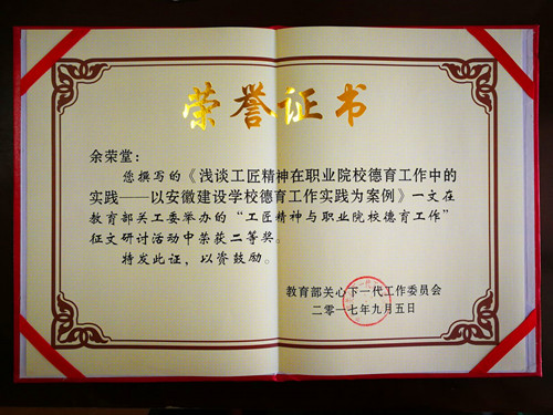 日前,从教育部网站传来喜讯,教育部关心下一代工作委员会举办的“工匠精神与职业院校德育工作”征文研讨活动评审结果揭晓,安徽省三所职业院校教师榜上有名。安徽建工技师学院(安徽建设学校)余荣堂老师撰写的《浅谈工匠精神在职业院校德育工作中的实践——以安徽建设学校德育工作实践为案例》一文荣获二等奖。