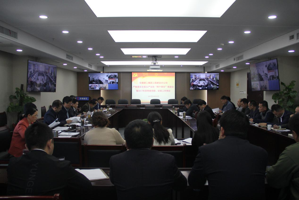 10月31日下午,安建建设公司召开落实全面从严治党“两个责任”专题部署会暨2017年四季度党群、纪委工作例会。公司领导班子成员、中层管理人员、群团组织负责人、所属各办事处、工管部、重点项目部班子成员、财务负责人,各基层党群负责人及党务工作者通过现场及分会场视频参加会议。会议由公司党委书记王可武主持。