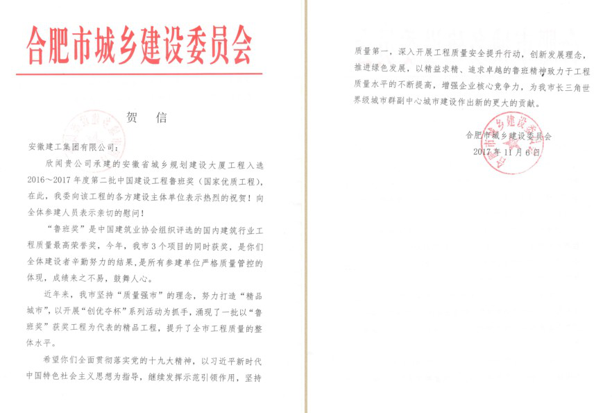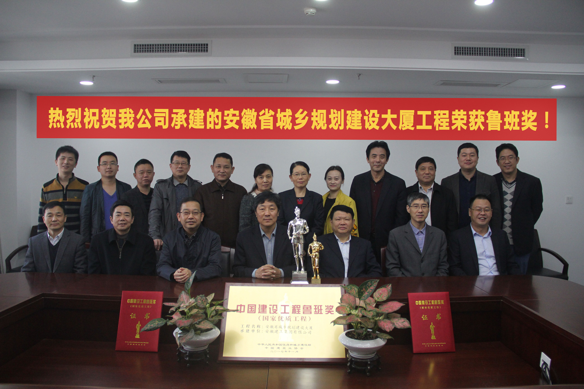 11月6日,中国建筑业在北京钓鱼台国宾馆召开会议,隆重发布“2016~2017年度中国建设工程鲁班奖(国家优质工程)暨召开纪念鲁班奖创立30周年大会”。我公司承建的安徽省城乡规划建设大厦工程喜获“鲁班奖”,集团公司荣获“创建鲁班奖优秀企业”,企业创优工作实现了新的历史突破!11月8日,合肥市城乡建设委员会发来贺信,热烈祝贺我公司承建的安徽省城乡规划建设大厦工程入选2016-2017年度中国建设工程鲁班奖(国家优质工程)。
