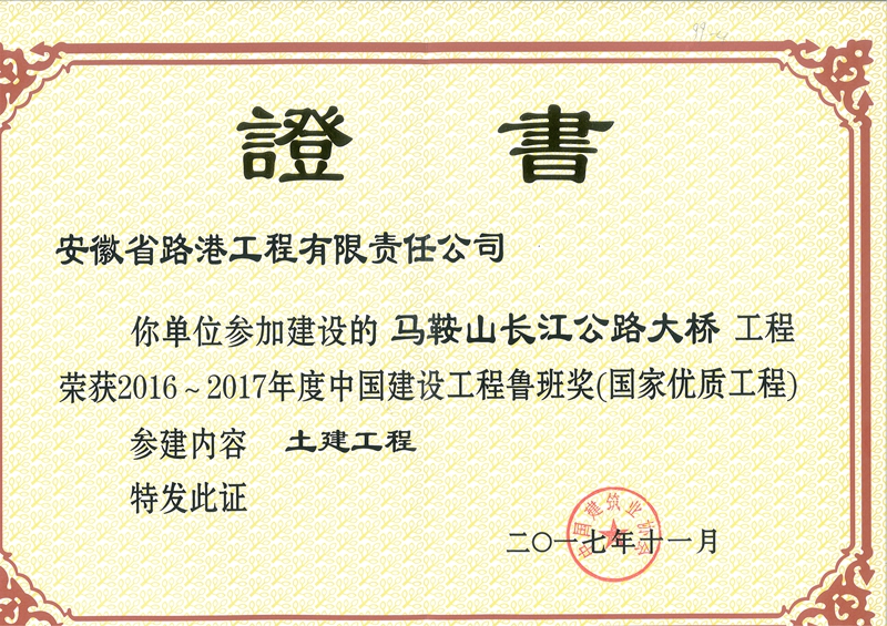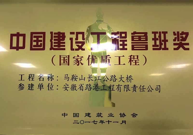 11月6日,从在北京钓鱼台国宾馆召开的纪念鲁班奖创立30周年暨2016~2017年度创精品工程经验交流会上传来喜讯,安徽路港参建的马鞍山长江公路大桥工程荣获2016年-2017年度中国建设工程鲁班奖(国家优质工程)。