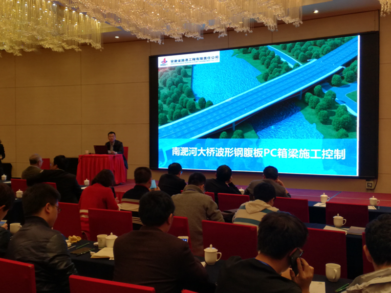 本次会议以安徽路港公司承建的南淝河大桥为工程背景,详细介绍了波形钢腹板桥梁的概况、发展与创新、桥梁类型的应用技术、波形钢腹板生产制造及施工控制等,内容丰富,涵盖全面。安徽路港郎溪路项目部赵家俊作为特邀讲师,对南淝河大桥波形钢腹板PC箱梁的施工控制进行了论述,深受与会人员好评。