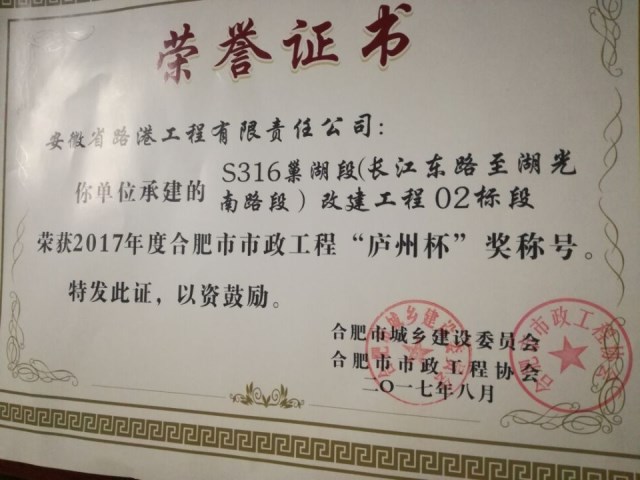 11月16日,从合肥市市政工程协会传来喜讯,安徽路港承建的S316巢湖段(长江东路至湖光南路)改建工程02标段喜获2017年度合肥市市政工程“庐州杯”奖。