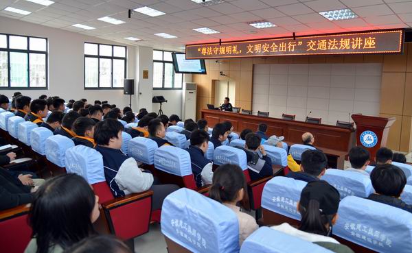 为迎接“12.2”交通安全日的到来,配合学院安全法制教育系列活动的开展,提高学生的交通意识,12月1日下午,安徽建工技师学院邀请包河交警大队综合科张能贵科长来学院开展了一次以“尊法守规明礼 文明安全出行”为主题的交通法规讲座。