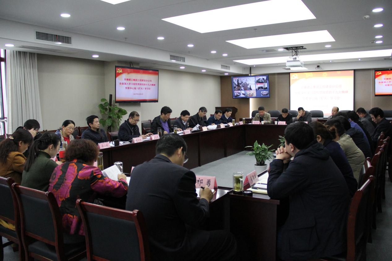 12月1日下午,安建建设公司召开了党委中心组学习(扩大)会,全面深入学习宣传贯彻党的十九大精神。公司领导班子成员、中层管理人员、各办事处、工管部、项目部主要负责人及所属各党支部负责人、通过现场及分会场视频参加会议。会议由公司党委书记王可武主持。