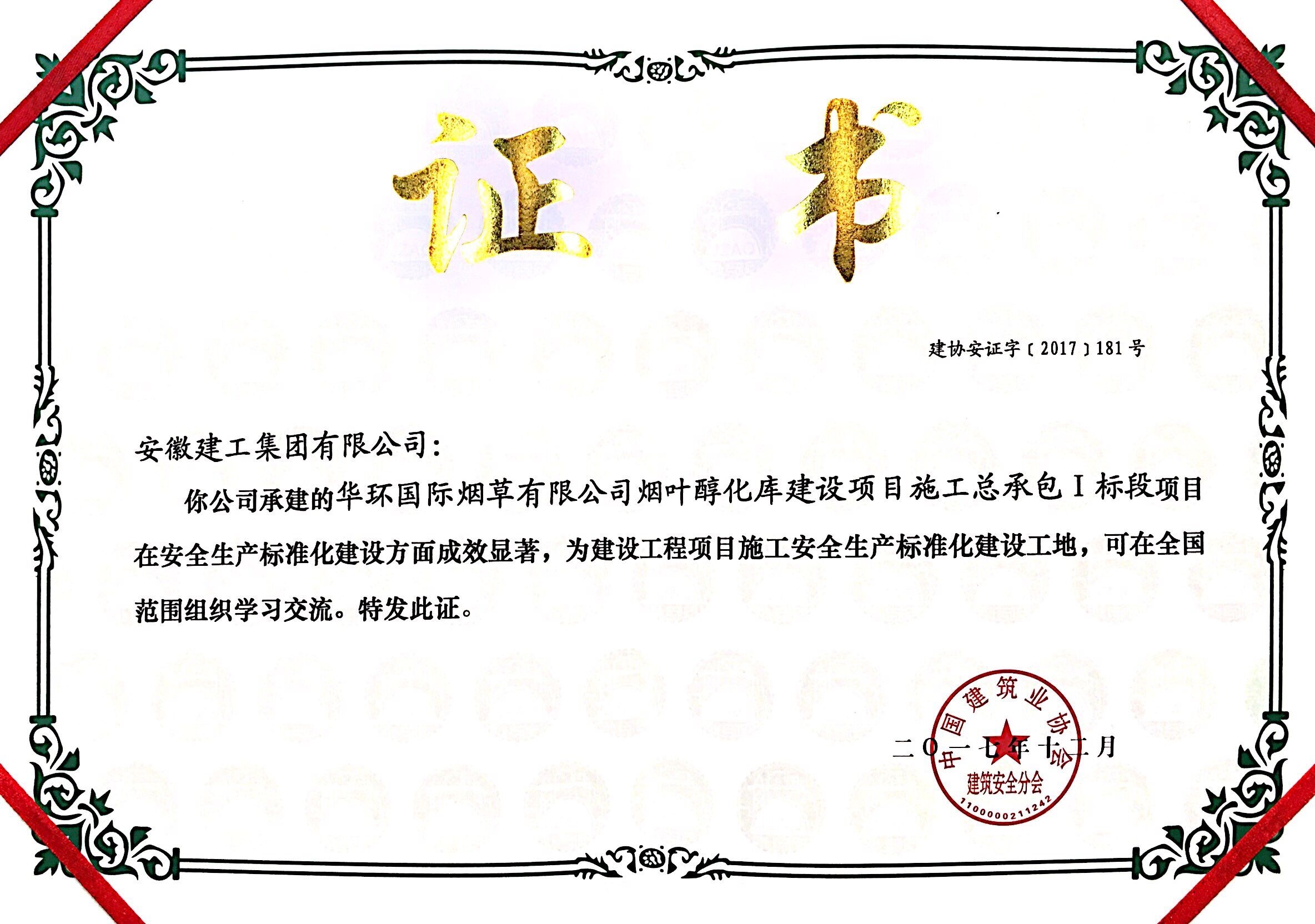 近日,从中国建筑业协会建筑安全分会2017年年会暨理事会上获悉,安建建设承建的华环烟草醇化库I标段项目被评为全国“建设工程项目施工安全生产标准化建设工地”。
