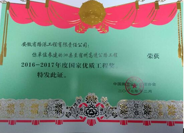 近日,安徽路港公司承建的泗宿高速10标在荣获交通部优质工程“李春奖”基础上,再次荣获2016-2017年度国家优质工程奖,这也是安徽路港首次获得该奖项。同时,徐士征同志被授予“国家优质工程突出贡献者”荣誉称号。
