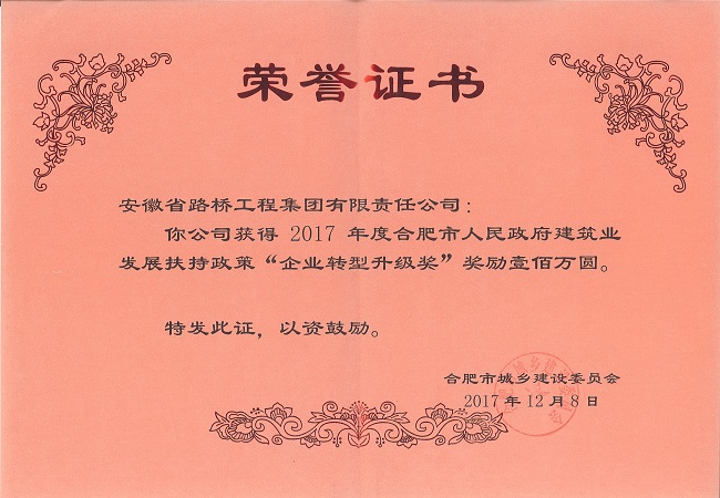 12月26日,合肥市城乡建设委员会组织召开了2017年合肥市建筑业转型发展座谈会,会上颁发了2017年度合肥市人民政府建筑业发展扶持政策“企业转型升级奖”荣誉证书,公司参加座谈会并获得此殊荣,获得奖励资金100万元。