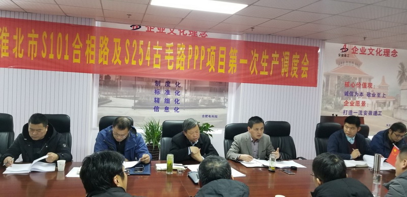 1月4日,淮北市S101合相路及S254古毛路PPP项目召开首次生产调度会,全力推动该项目建设管理工作。会议由安建投资公司副总经理、淮北安建交通建设有限公司董事长黄国平主持,淮北市交通运输局副局长李文才及相关局领导应邀出席。淮北安建交通建设有限公司总经理周忠、项目公司各部门、设计单位、施工单位、监理单位等各参建单位负责人参加会议。