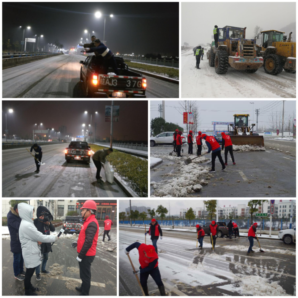 24日夜,工管部各项目彻夜通明,负责人带头坚守办公室值班,全体管理人员24小时开机严阵以待。施工道路上,项目管理人员跟随调配车辆沿路泼洒工业盐及融雪剂,防止夜间道路结冰。25日清晨,工管部调配铲车,组织青年志愿者队伍,带着扫雪铲等工具,来到泾县城区道路清扫积雪,方便来往车辆和行人通行。泾县电视台记者闻讯赶到现场,对工管部义务清扫道路积雪进行了采访。